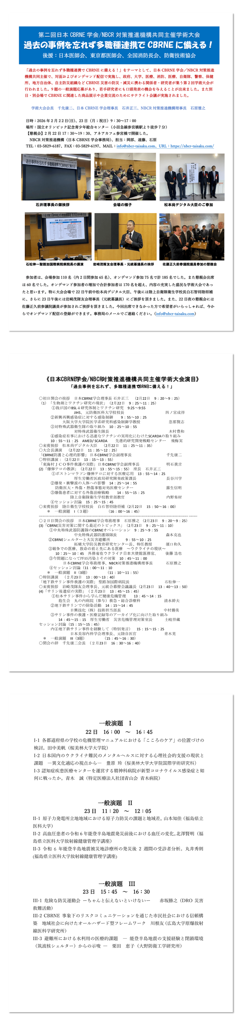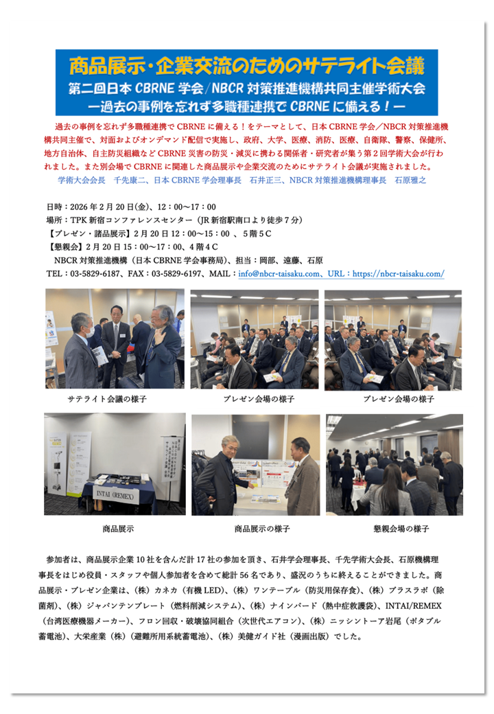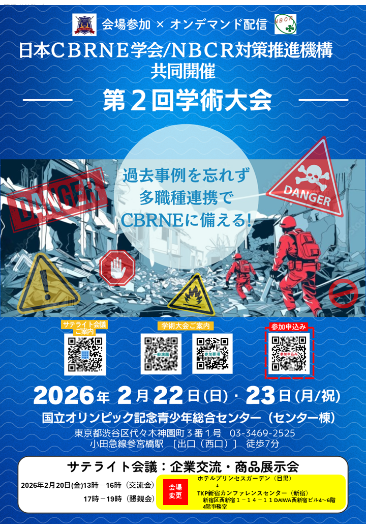 複合事象対応には様々な方面からの学際的なアプローチが問題解決に必要となります。そのためには行政組織やさまざまな専門家が一堂に介するアカデミックな場においてデータベースを構築し、また情報共有することが求められます。今回発足する「日本CBRNE学会」が、時代に即した人命救助と健康支援や人道支援全般を支える多職種の方々の集うオープンプラットフォームとして機能することにより、危機に柔軟な対応ができるレジリエントな社会となり、未来にわたる日本の平和と安定に寄与することを期待しています。